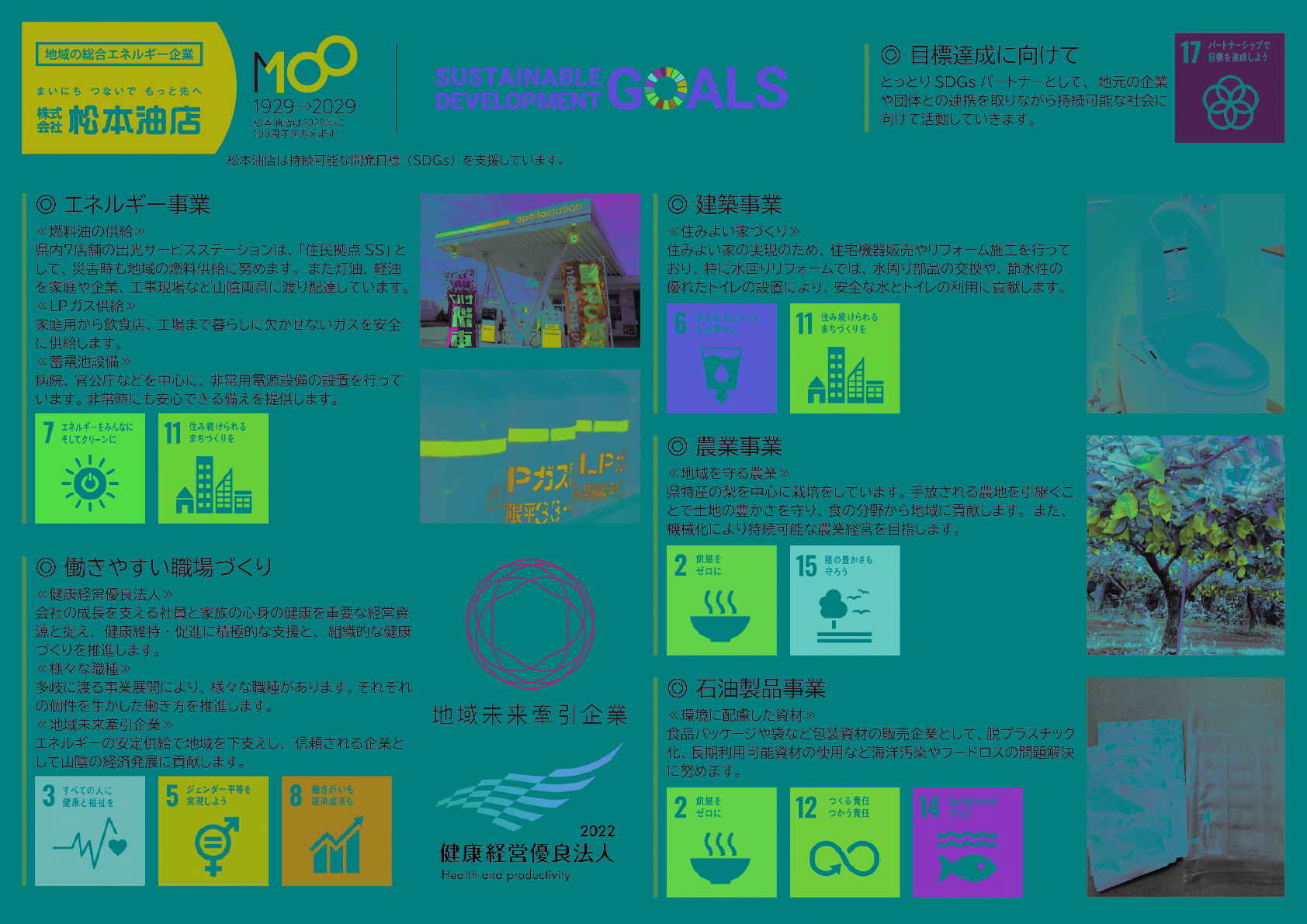 「お客様ともに取り組むSDGs」、「地域と一緒に歩むSDGs」、「スタッフと目指すSDGs」という3つのスローガンを掲げ、以下の活動に取り組んでいます。1)お客様ともに取り組むSDGs