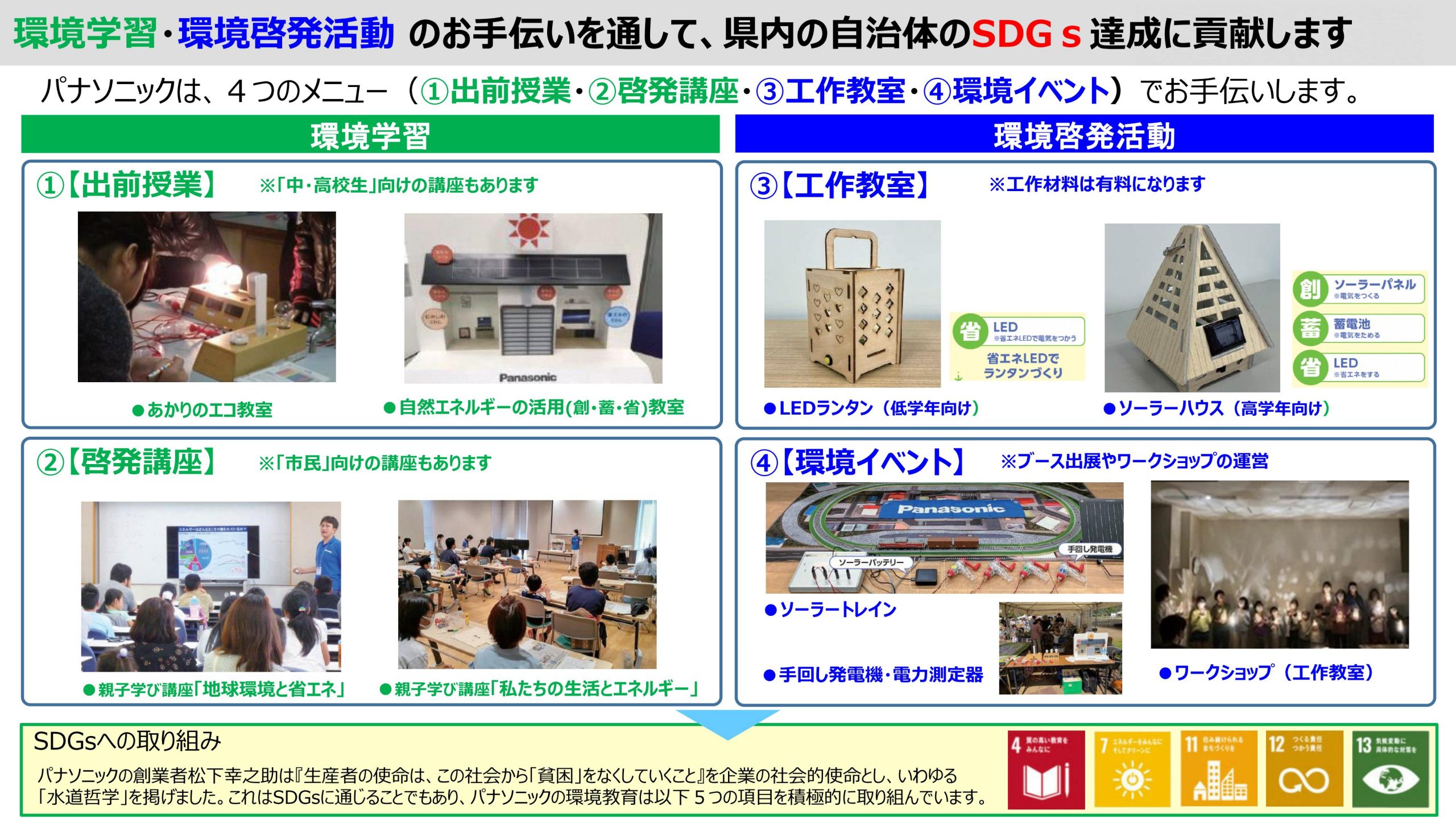 パナソニックグループは長期ビジョン「Panasonic GREEN IMPACT」を掲げており、今後は企業活動の「会社と社員による社会貢献」を環境面で取り組むことで、県民が活き活きとくらす「サスティナブルな共存共栄」の実現を目指していきたい思います。具体的には県内の各自治体が主催する環境教育や環境の啓発活動に積極的に参画して、出前講座や工作教室、環境イベントへの出展などを通じてSDGs達成に貢献していきます。・Panasonic GREEN IMPACT: