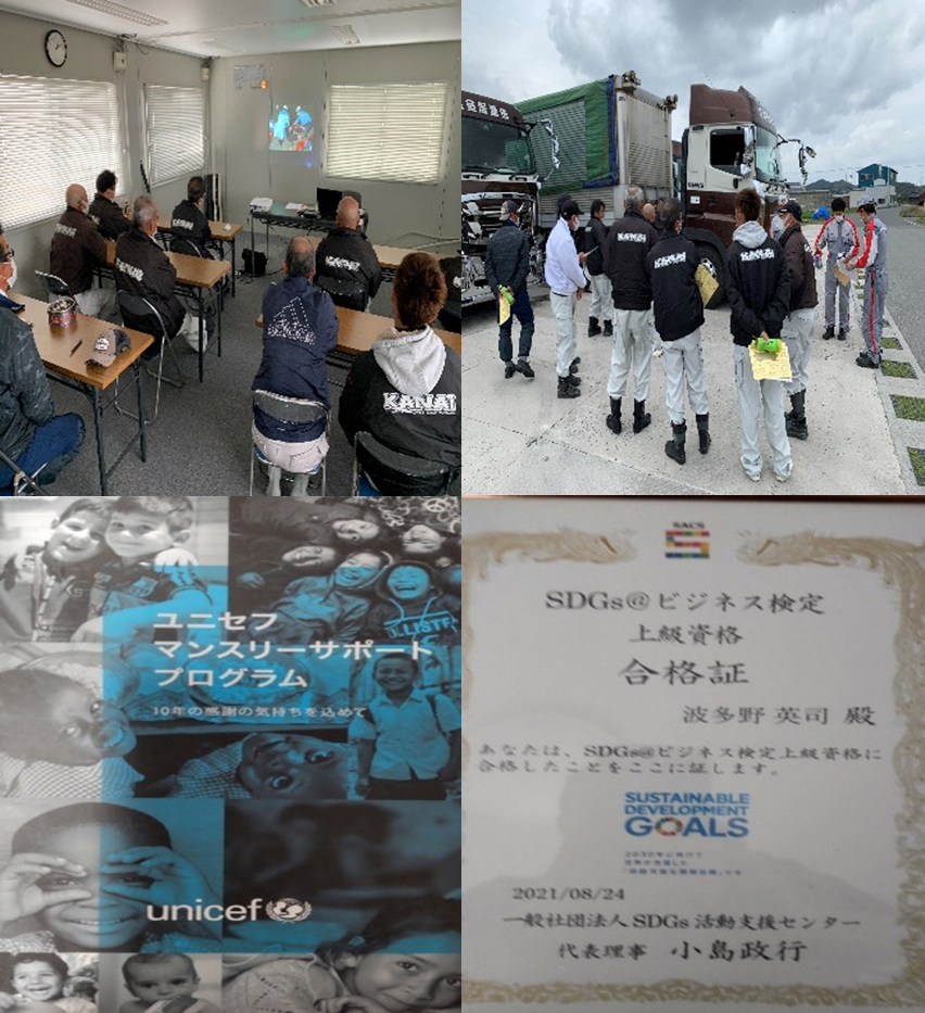 新型触媒機能を備えた車両の導入による、排気ガス削減。デジタルタコグラフのクラウド化、FAXのデジタル化をする事で、紙資源の削減。デジタルタコグラフ・ドライブレコーダー搭載により速度を抑制し、事故を事前に防止すると同時に教育を行っています。コロナ禍においては、マスク20,000枚の寄付。ユニセフ団体等への資金寄付。各社員個人でのSDGsビジネス上級資格取得を推奨し、SDGs参加への意義を深めます。