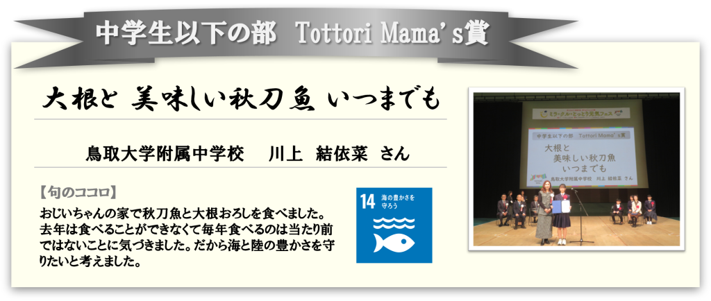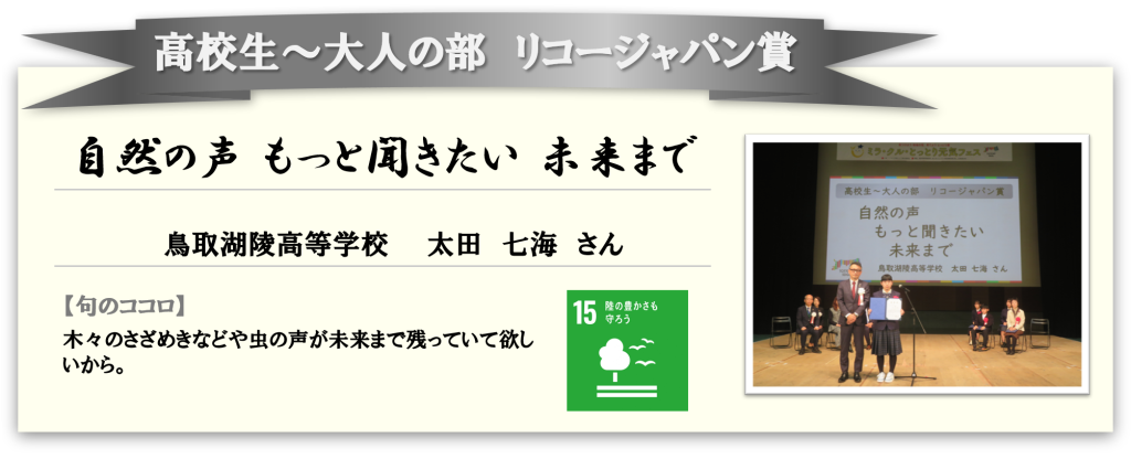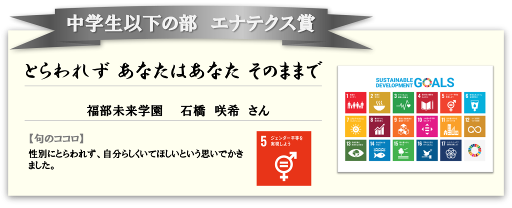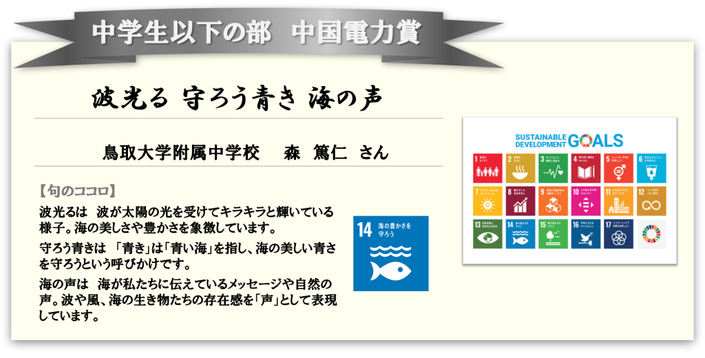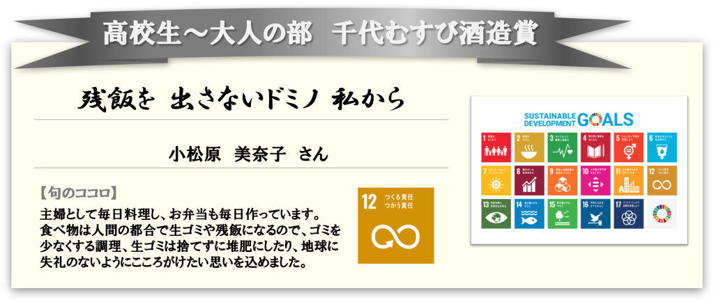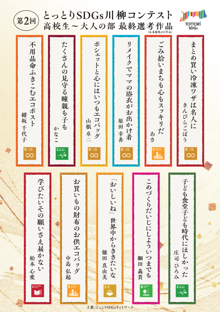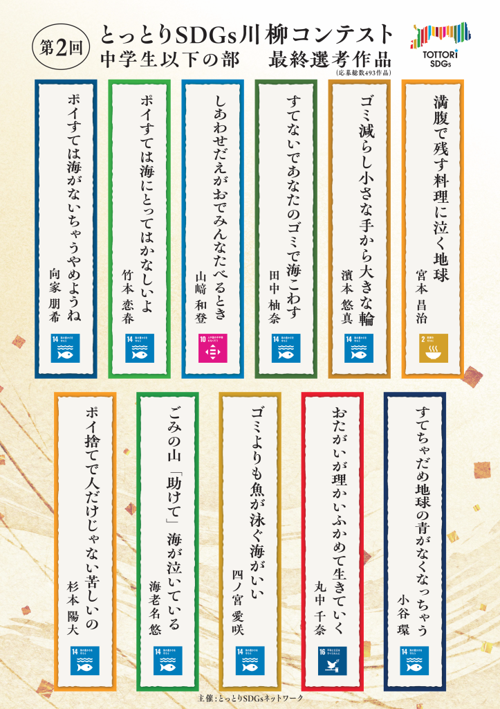この川柳コンテストは、SDGsに対する関心を高めるとともに、日常生活や企業活動等においてSDGsの目標達成に向けた実践への機運を盛り上げることを目的として、昨年度初めて開催されました。