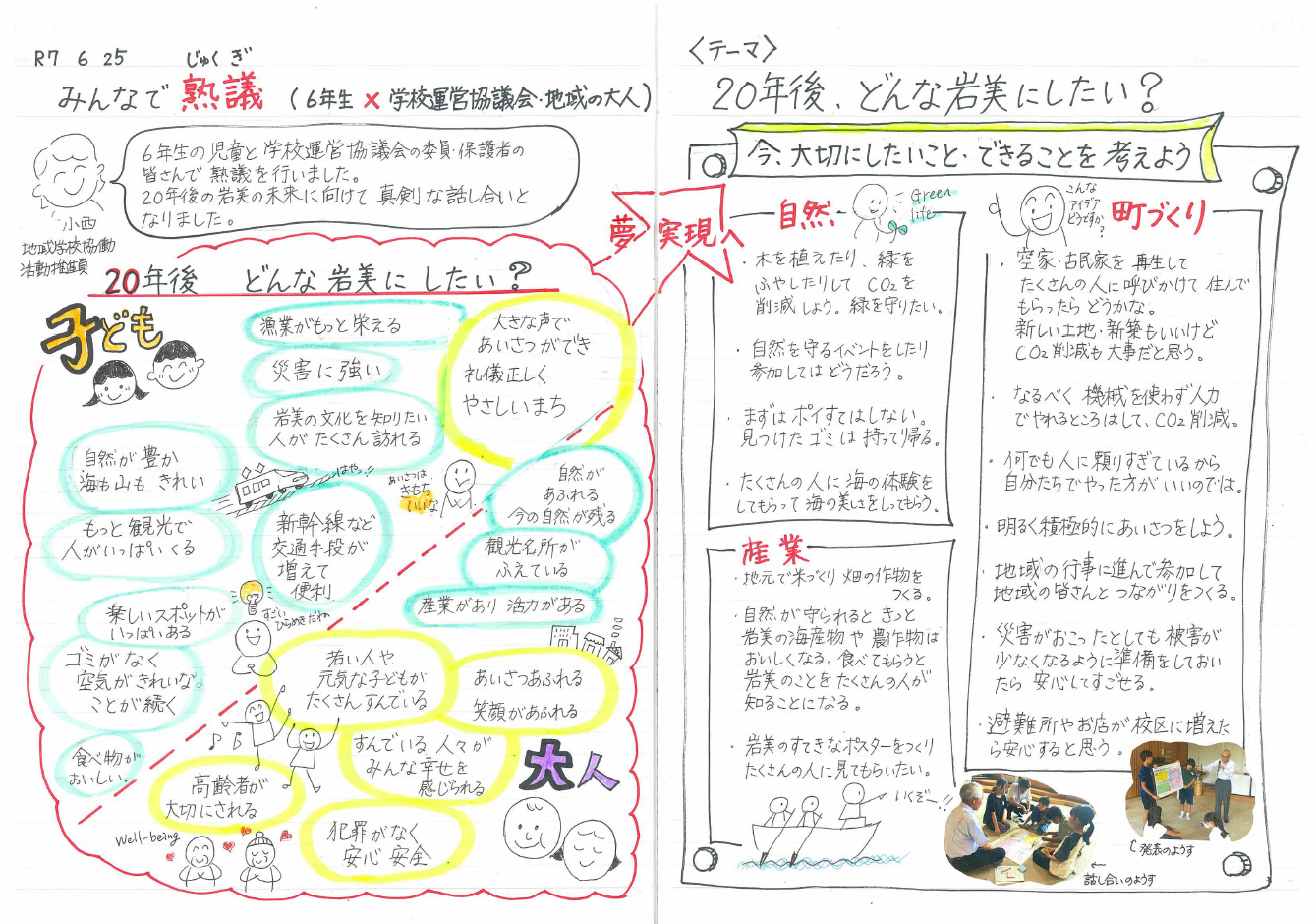 地域の大人と一緒に、人口減少や環境保全など岩美町の課題について学習しました。その上で、10年後の町の姿について意見を出し合い、より良い地域づくりの方法を考えました。多世代で対話することで、自分達にも町の未来をつくる役割があることを理解しました。