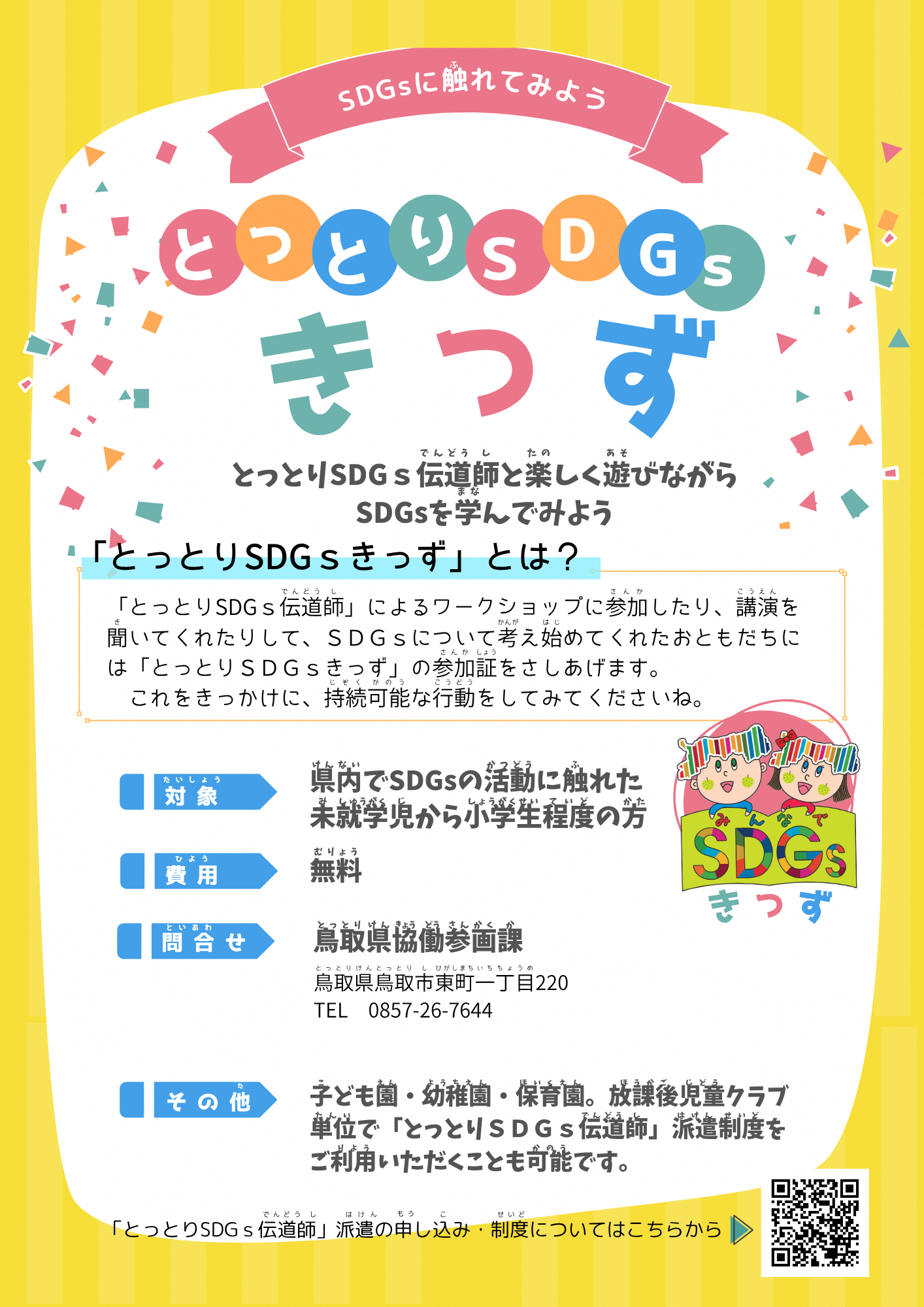 そこで、SDGsに触れたり、持続可能性について考え始めてくれた方を「とっとりSDGsきっず」と呼ぶことにします。